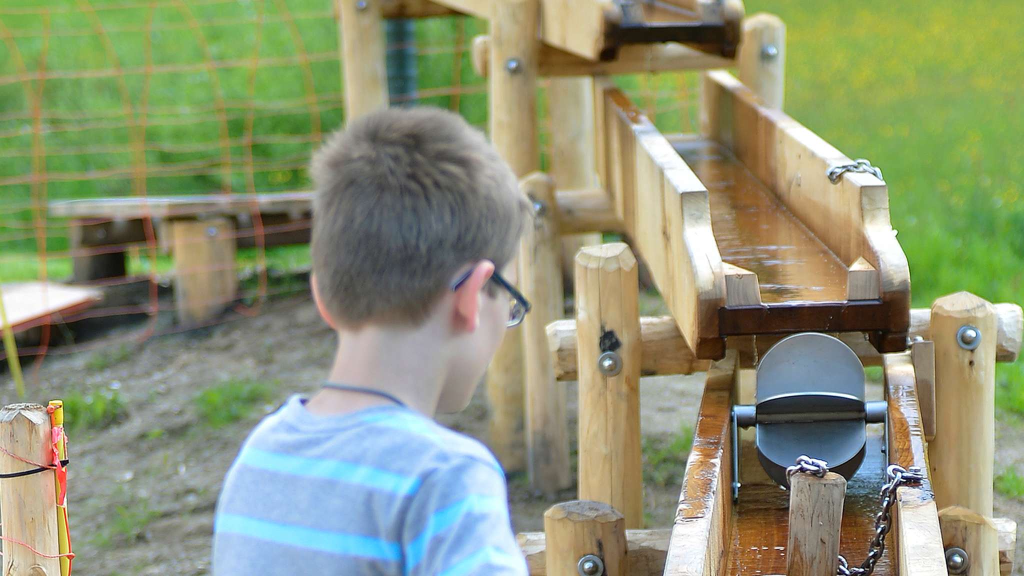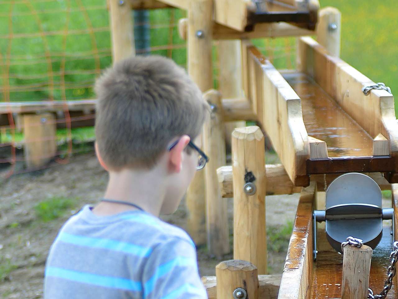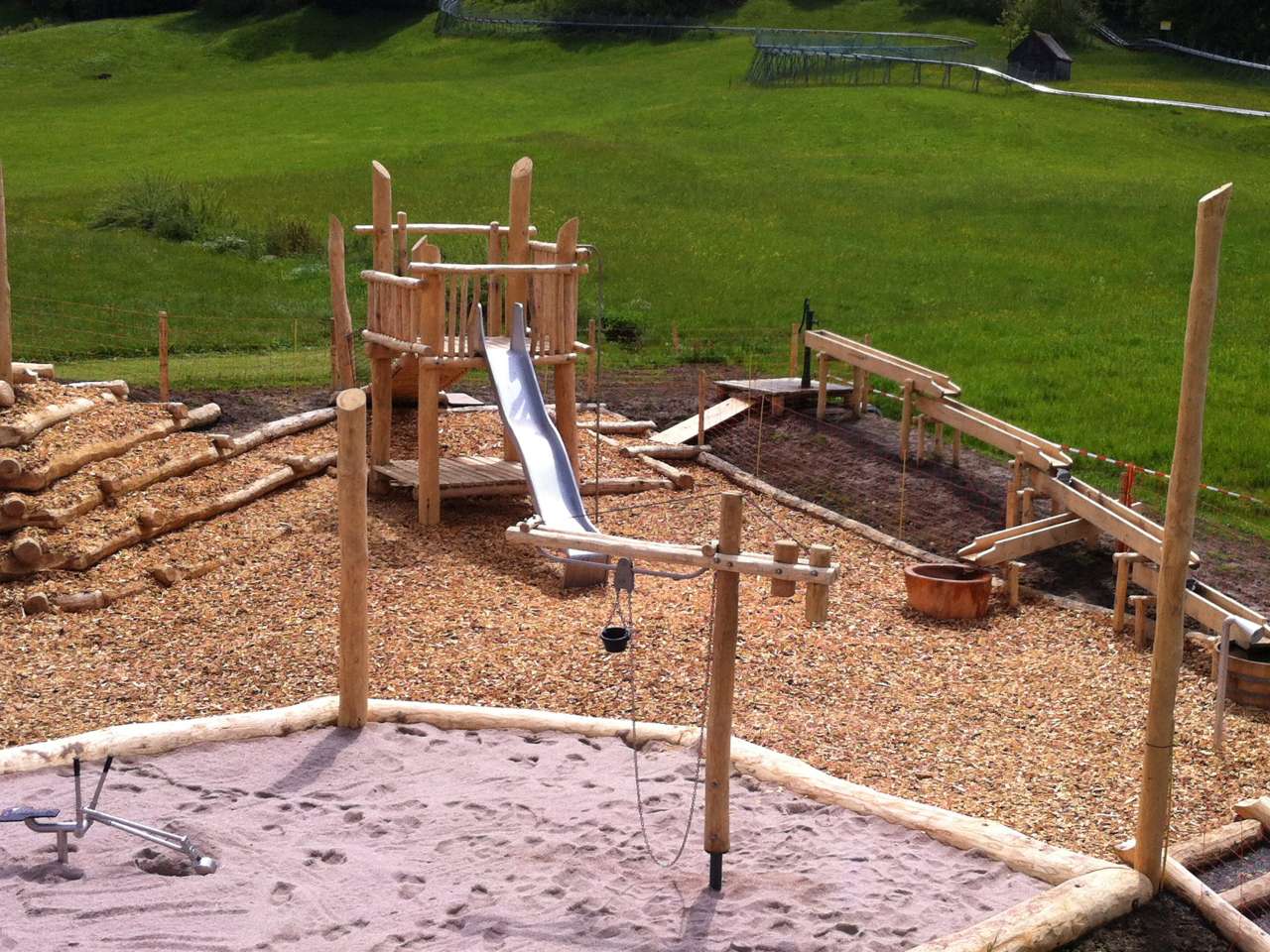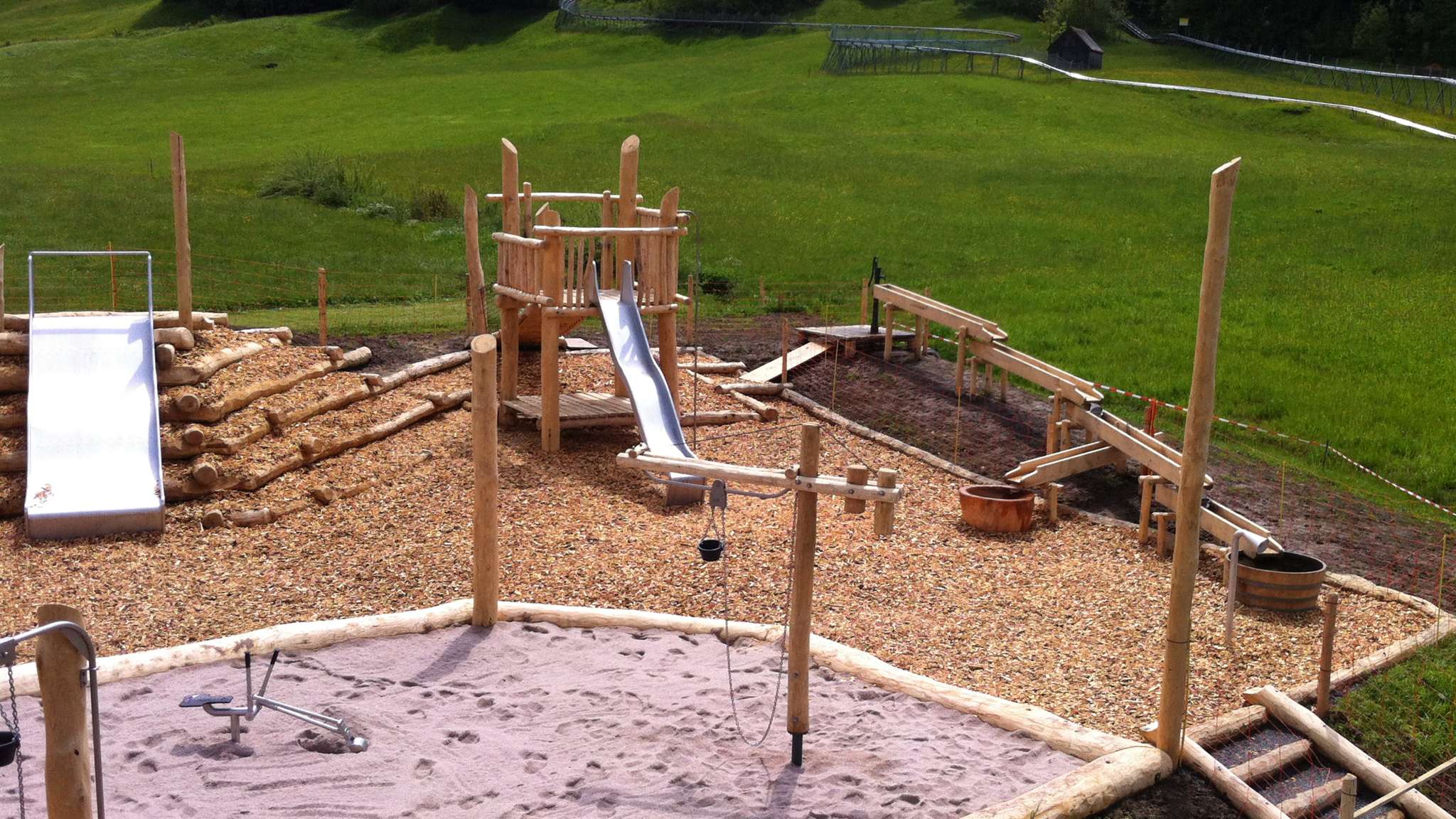 Wir bieten einen Riesensandkasten mit Sandpodest und Sandmühle, einen Baukran, verschiedene Rutschbahnen, coole Wasserspiele, ein Sprechrohr, ein Massivholzhäuschen zum Verstecken, ein Luftkissen sowie ein Mini-Fussballfeld.
